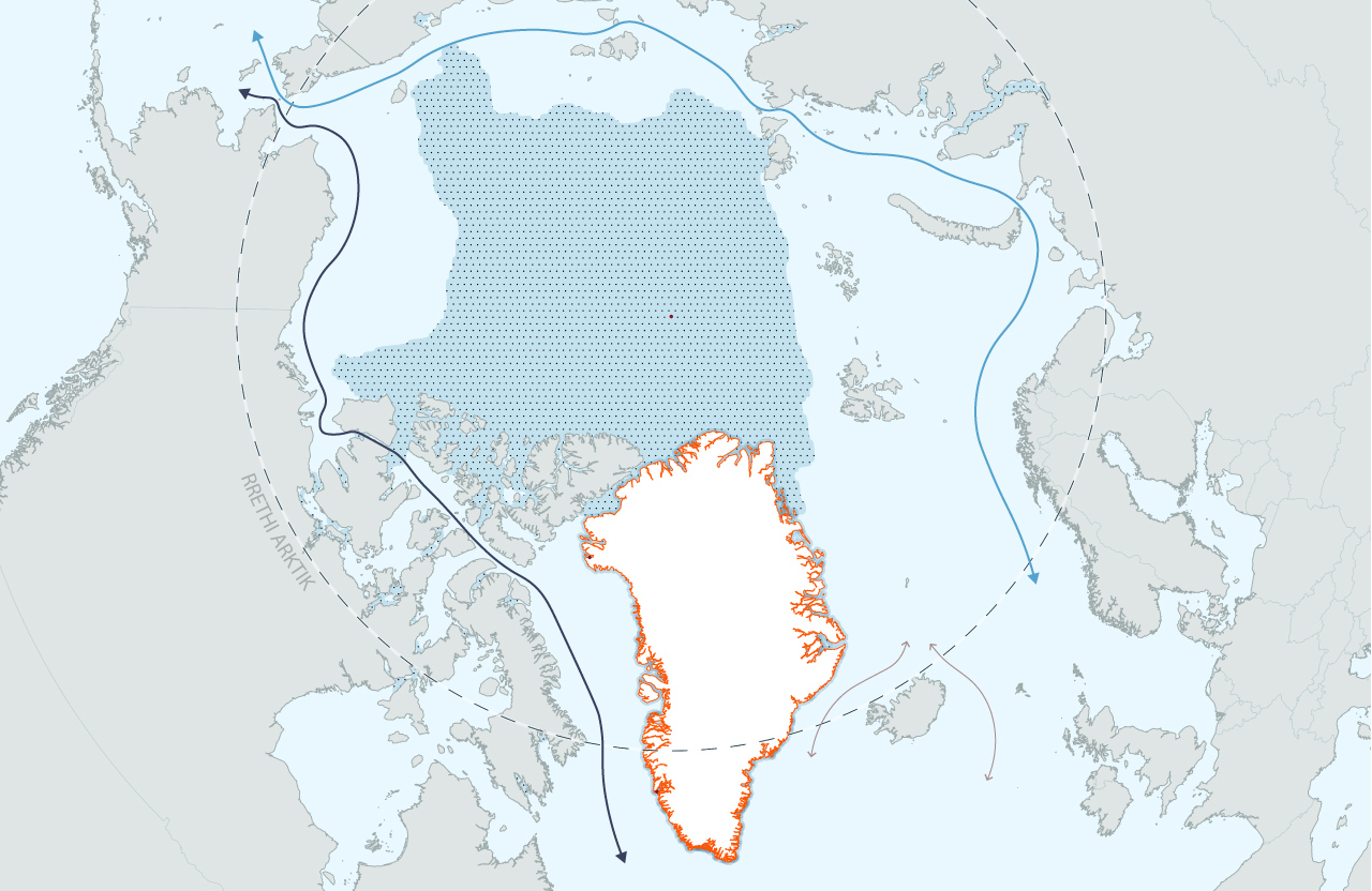 Grenlanda zë një pozicion strategjik mes dy rrugëve në zhvillim të transportit detar në Arktik – Kalimin Veriperëndimor dhe Rrugën Detare Veriore – si dhe mbikëqyr shtegun ujor GIUK, një grykë e rëndësishme detare.